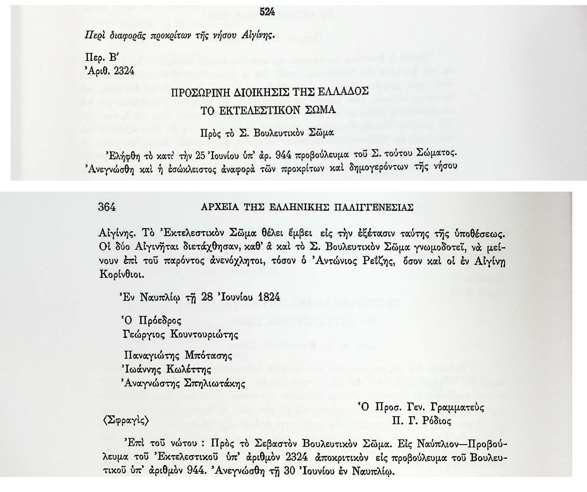ΑΡΧΕΙΑ ΕΛΛΗΝΙΚΗΣ ΠΑΛΙΓΓΕΝΕΣΙΑΣ, τ.10, σελ.363,αρ.524 «Λυτά Έγγραφα» Α’ & Β’ Βουλευτικής Περιόδου-Έγγραφα Εκτελεστικού Σώματος-Σχετικά με αναφορά προκρίτων και δημογερόντων . ΑίγιναΑναγνώστης ΣπηλιωτάκηςΑντώνιος ΡεΐζηςΒουλευτικό ΣώμαΓεώργιος ΚουντουριώτηςΔημογέροντεςΕκτελεστικό ΣώμαΕλλάδαΙωάννης ΚωλέττηςΚόρινθοςΝαύπλιοΠ.Γ.ΡόδιοςΠαναγής ΜπότασηςΠρόκριτοιΠροσωρινή Διοίκηση