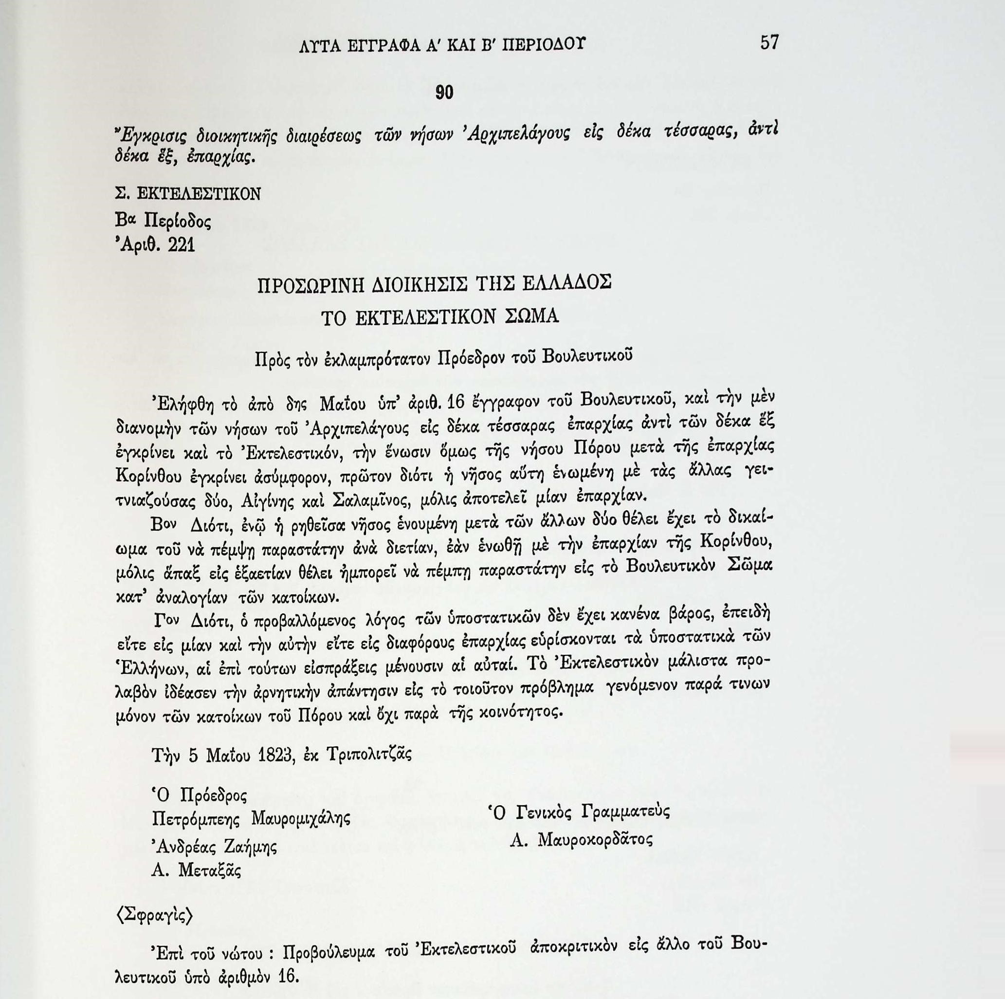 ΑΡΧΕΙΑ ΕΛΛΗΝΙΚΗΣ ΠΑΛΙΓΓΕΝΕΣΙΑΣ, τ.10, σελ.57,αρ.90 «Λυτά Έγγραφα» Α’ & Β’ Βουλευτικής Περιόδου-Έγγραφα Εκτελεστικού Σώματος-Άρνηση ένωσης Επαρχιών Κορίνθου και Πόρου. Α. ΜεταξάςΑ.Δ. ΖαΐμηςΑίγιναΑλ.ΜαυροκορδάτοςΒουλευτικό ΣώμαΕκτελεστικό ΣώμαΕλλάδαΕπαρχίεςΚορινθίαΚόρινθοςΠ. ΜαυρομιχάληςΠαραστάτεςΠετρόμπεης ΜαυρομιχάληςΠόροςσαλαμίναΤρίπολη