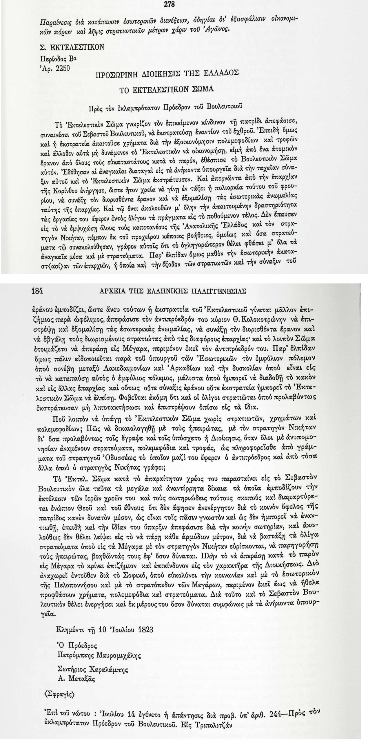 ΑΡΧΕΙΑ ΕΛΛΗΝΙΚΗΣ ΠΑΛΙΓΓΕΝΕΣΙΑΣ, τ.10, σελ.183,αρ.278 «Λυτά Έγγραφα» Α’ & Β’ Βουλευτικής Περιόδου-Έγγραφα Εκτελεστικού Σώματος-Σχετικά με το φρούριο της Ακροκορίνθου, την έλλειψη χρημάτων και πολεμοφοδίων για τον Αγώνα και τις συνέπειες του εμφυλίου πολέμου. Α. ΜεταξάςΒουλευτικό ΣώμαΕκστρατείαΕκτελεστικό ΣώμαΕλλάδαΕμφύλιοςΕπαρχίεςΈρανοςΘ.ΚολοκοτρώνηςΚορινθίαΚόρινθοςΜέγαραΠ. ΜαυρομιχάληςΠετρόμπεης ΜαυρομιχάληςΠόλεμοςΠροσωρινή ΔιοίκησηΣ.ΧαραλάμπηςΣτρατός-ΣτρατιώτεςΤρίποληΦρούριαΧρήματα