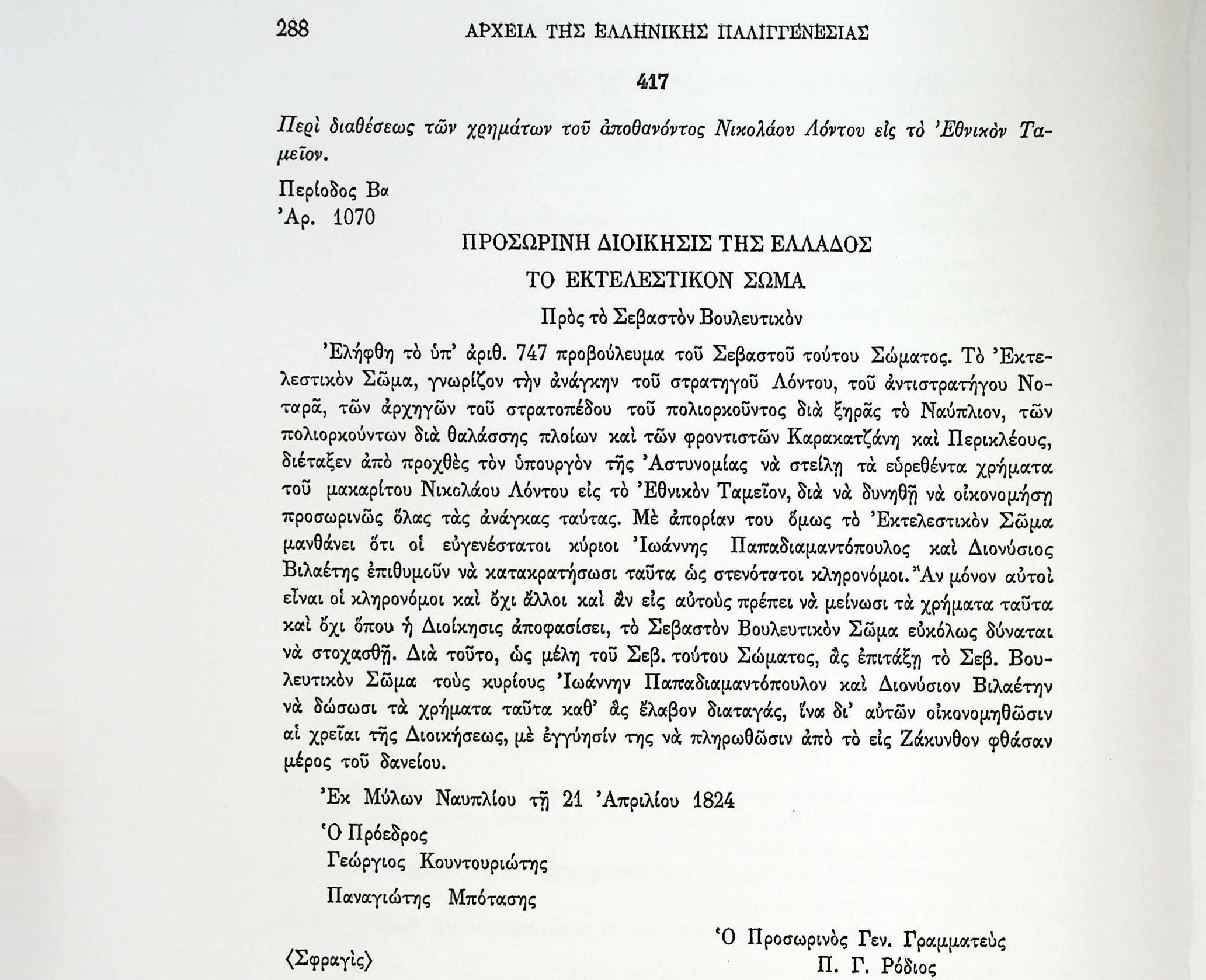 ΑΡΧΕΙΑ ΕΛΛΗΝΙΚΗΣ ΠΑΛΙΓΓΕΝΕΣΙΑΣ, τ.10, σελ.288,αρ.417 «Λυτά Έγγραφα» Α’ & Β’ Βουλευτικής Περιόδου-Έγγραφα Εκτελεστικού Σώματος-Διάθεση χρημάτων αποθανόντος Νικολάου Λόντου. Βουλευτικό ΣώμαΓεώργιος ΚουντουριώτηςΔιονύσιος ΒιλαέτηςΕθνικό ΤαμείοΕκτελεστικό ΣώμαΕλλάδαΘάνατοςΙωάννης ΠαπαδιαμαντόπουλοςΜύλοι ΆργουςΝαύπλιοΝικόλαος ΛόντοςΠ.Γ.ΡόδιοςΠαναγής ΜπότασηςΦροντιστήςΧρήματα