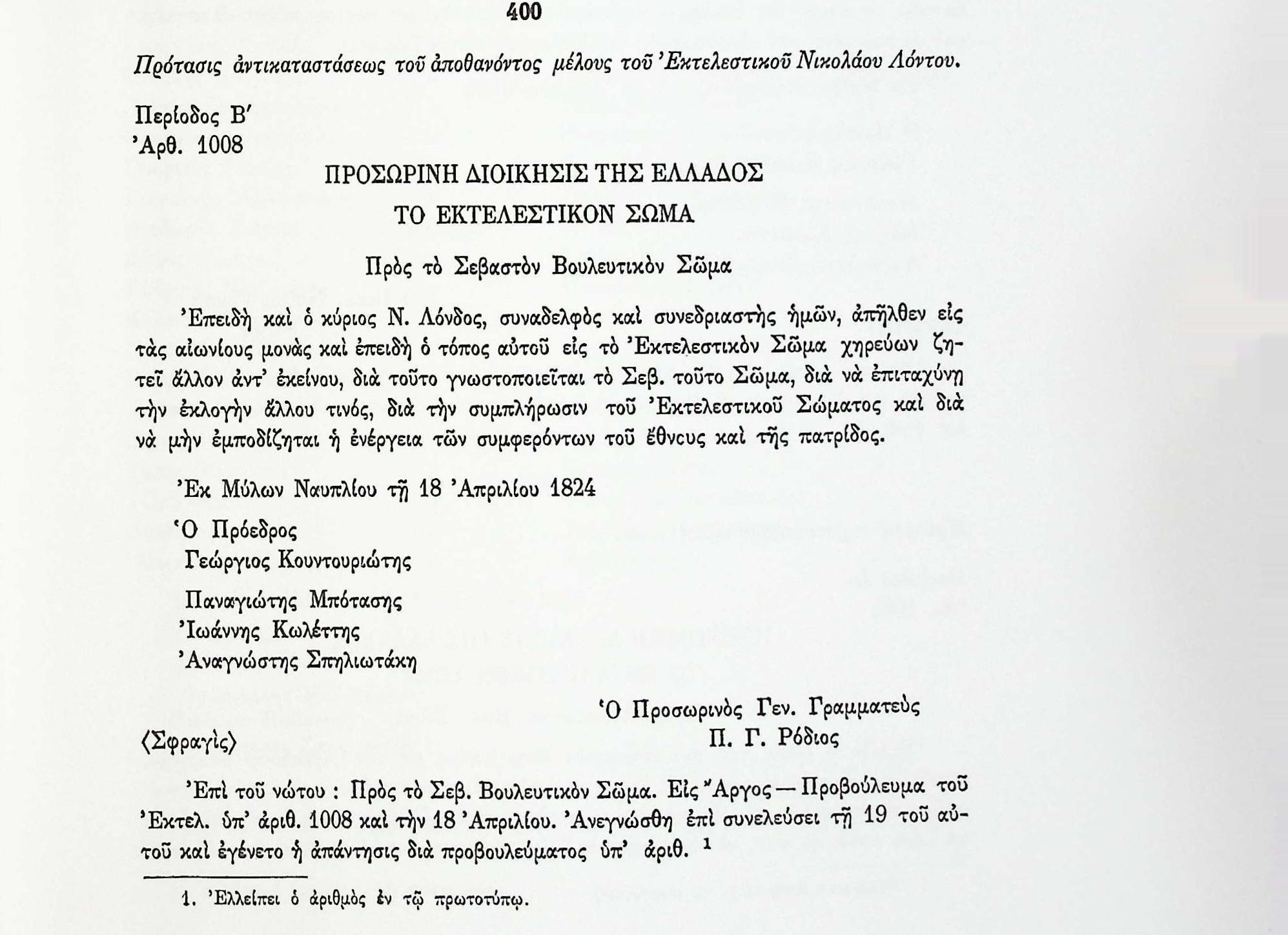 ΑΡΧΕΙΑ ΕΛΛΗΝΙΚΗΣ ΠΑΛΙΓΓΕΝΕΣΙΑΣ, τ.10, σελ.275,αρ.400 «Λυτά Έγγραφα» Α’ & Β’ Βουλευτικής Περιόδου-Έγγραφα Εκτελεστικού Σώματος-Αίτημα για αντικατάσταση στο εκτελεστικό Σώμα του Νικολάου Λόντου λόγω του θανάτου του. Αναγνώστης ΣπηλιωτάκηςΒουλευτικό ΣώμαΓεώργιος ΚουντουριώτηςΕλλάδαΘάνατοςΙωάννης ΚωλέττηςΜύλοι ΆργουςΝικόλαος ΛόντοςΠ.Γ.ΡόδιοςΠαναγής ΜπότασηςΠροσωρινή Διοίκηση