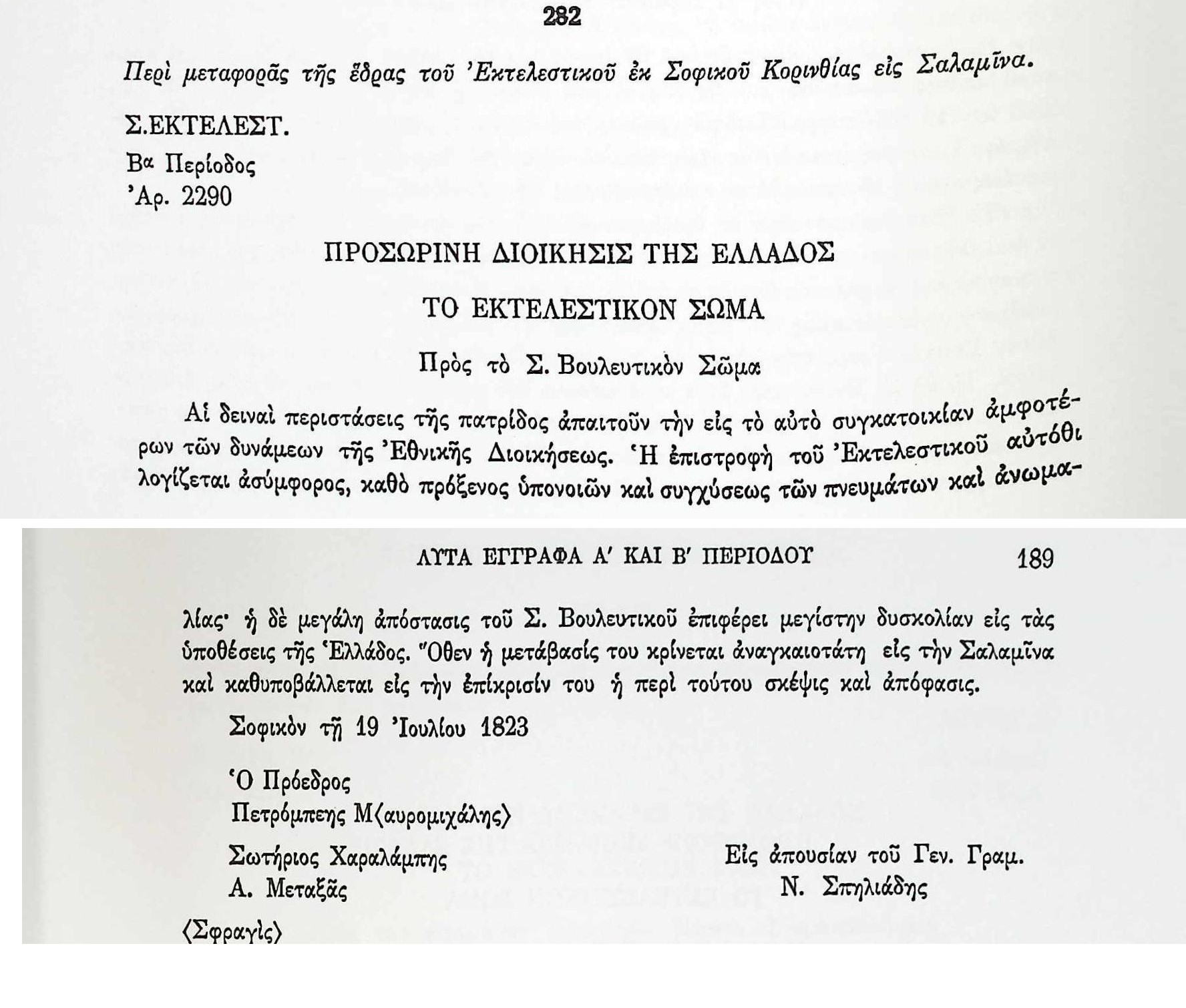 ΑΡΧΕΙΑ ΕΛΛΗΝΙΚΗΣ ΠΑΛΙΓΓΕΝΕΣΙΑΣ, τ.10, σελ.188,αρ.282 «Λυτά Έγγραφα» Α’ & Β’ Βουλευτικής Περιόδου-Έγγραφα Εκτελεστικού Σώματος-Μεταφορά Εκτελεστικού Σώματος από το Σοφικό στη Σαλαμίνα. Α. ΜεταξάςΒουλευτικό ΣώμαΕκτελεστικό ΣώμαΕλλάδαΚορινθίαΝ. ΣπηλιάδηςΠ. ΜαυρομιχάληςΠετρόμπεης ΜαυρομιχάληςΣ.ΧαραλάμπηςΣαλαμίνα