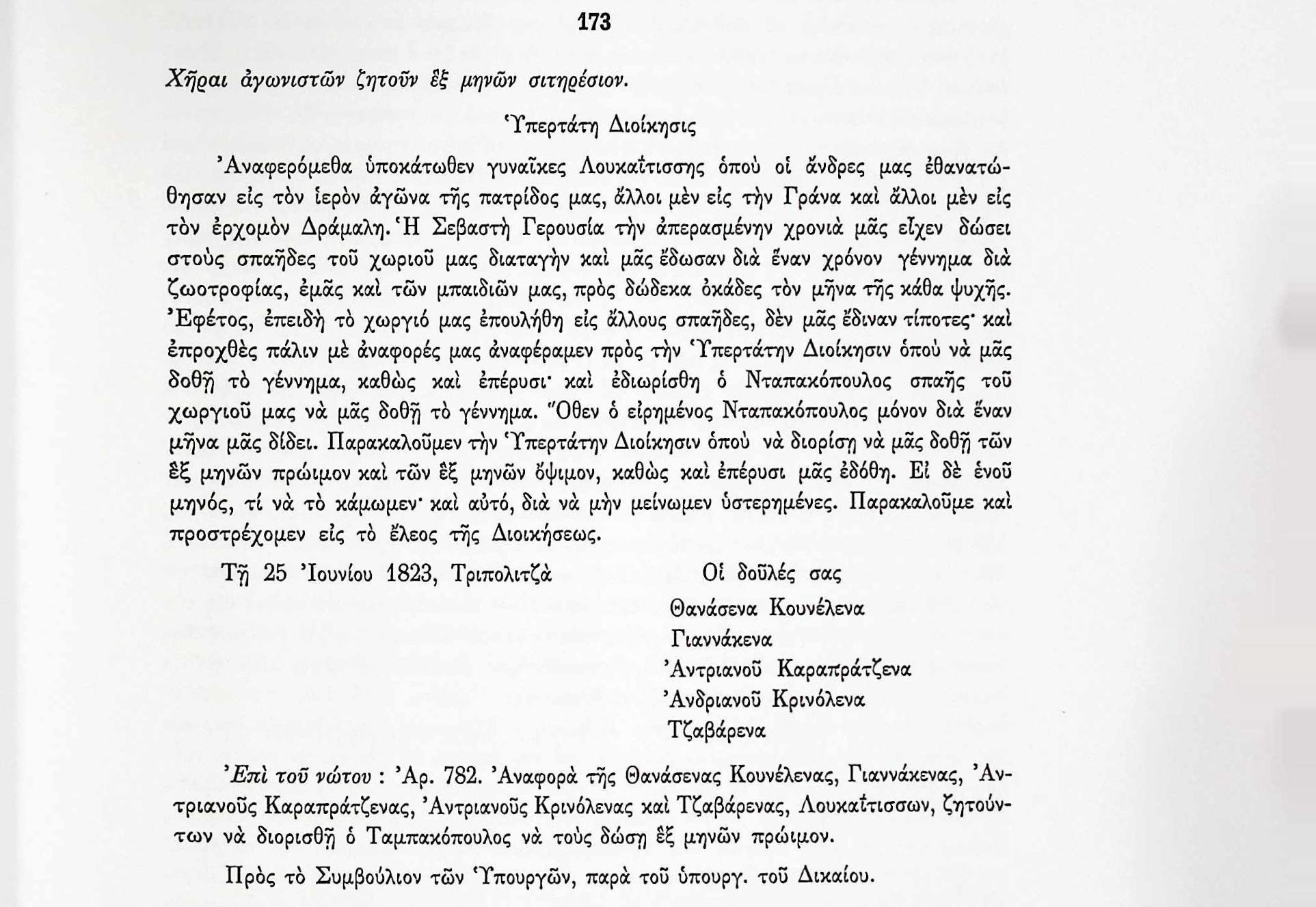 ΑΡΧΕΙΑ ΕΛΛΗΝΙΚΗΣ ΠΑΛΙΓΓΕΝΕΣΙΑΣ, τ.11, σελ.189,αρ.173 «Λυτά Έγγραφα» Α’ & Β’ Βουλευτικής Περιόδου-Έγγραφα Εκτελεστικού Σώματος-Αίτημα από χήρες συζύγους αποθανόντων αγωνιστών, για παροχή βοήθειας. Ανδριανού ΚρινόλεναΑντριανού ΚΑραπράτζεναΓεννήματαΓιαννάκεναΓράναΔράμαληςΕκτελεστικό ΣώμαΕλλάδαΘανάσενα ΚουνέλεναΝταπακόπουλοςΤζαβάρεναΤρίποληΥπέρτατη ΔιοίκησηΥπουργός Δικαιοσύνης