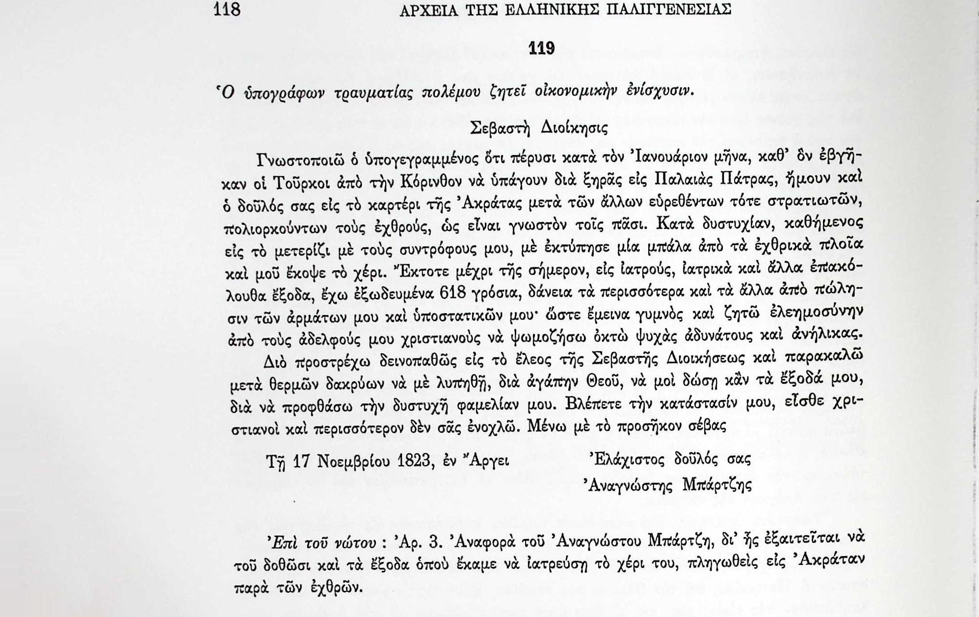 ΑΡΧΕΙΑ ΕΛΛΗΝΙΚΗΣ ΠΑΛΙΓΓΕΝΕΣΙΑΣ, τ.11, σελ.119,αρ.118 «Λυτά Έγγραφα» Α’ & Β’ Βουλευτικής Περιόδου-Έγγραφα προς την Υπέρτατη Διοίκηση-Αίτημα τραυματία πολέμου για οικονομική ενίσχυση. ΑκράταΑναγνώστης ΜπάρτζηςΆργοςγρόσιαΕλλάδαΚορινθίαΚόρινθοςΟθωμανοί-ΤούρκοιΠ.ΠάτραςΠλοίαΠρόνοιαΤραυματισμός