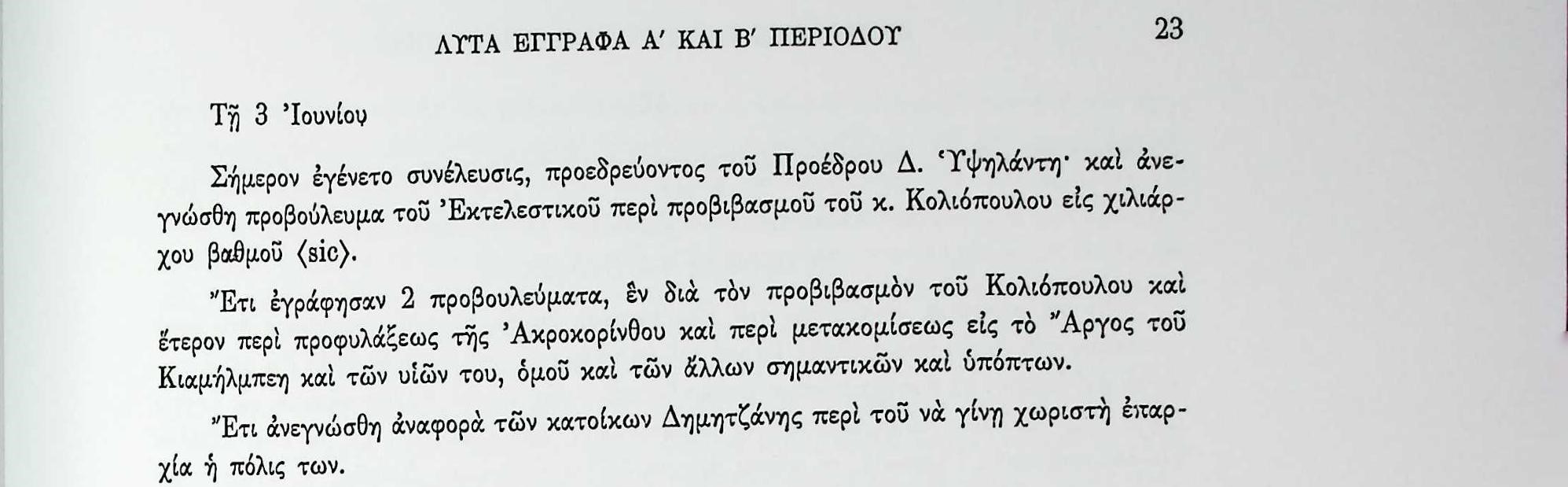 ΑΡΧΕΙΑ ΕΛΛΗΝΙΚΗΣ ΠΑΛΙΓΓΕΝΕΣΙΑΣ, τ.12, σελ.23-03 Ιουνίου 1822 «Λυτά Έγγραφα» Α’ & Β’ Βουλευτικής Περιόδου-Έγγραφα Βουλευτικού Σώματος-Περί προφύλαξης Ακροκορίνθου, μεταφοράς του Κιαμήλ Μπέη στο Άργος και στρατιωτικού προβιβασμού. ΑκροκόρινθοςΆργοςΔ. ΥψηλάντηςΔημήτριος ΥψηλάντηςΔημητσάναΕκτελεστικό ΣώμαΕλλάδαΚιαμήλ ΜπέηςΚορινθίαΚόρινθοςΣτρατηγός Κολιόπουλος
