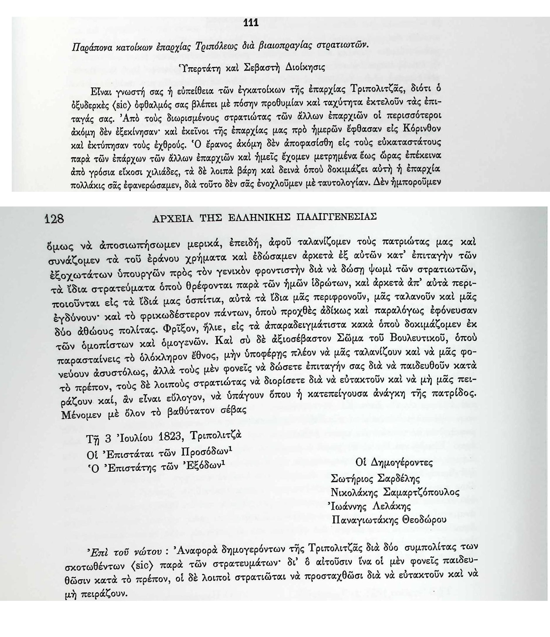 ΑΡΧΕΙΑ ΕΛΛΗΝΙΚΗΣ ΠΑΛΙΓΓΕΝΕΣΙΑΣ,τ.12,σελ.127, αρ.111 «Λυτά Έγγραφα» Α’ & Β’ Βουλευτικής Περιόδου-Έγγραφα Βουλευτικού Σώματος-Παράπονα για βιαιοπραγίες στρατιωτών. γρόσιαΔημογέροντεςΔολοφονίαΕλλάδαΕπαρχίεςΙωάννης ΛελάκηςΚορινθίαΚόρινθοςΝικολάκης ΣαμαρτζόπουλοςΠαναγιωτάκης ΘεοδώρουΣτρατός-ΣτρατιώτεςΣωτήριος ΣαρδέληςΤρίποληΥπέρτατη ΔιοίκησηΦροντιστής