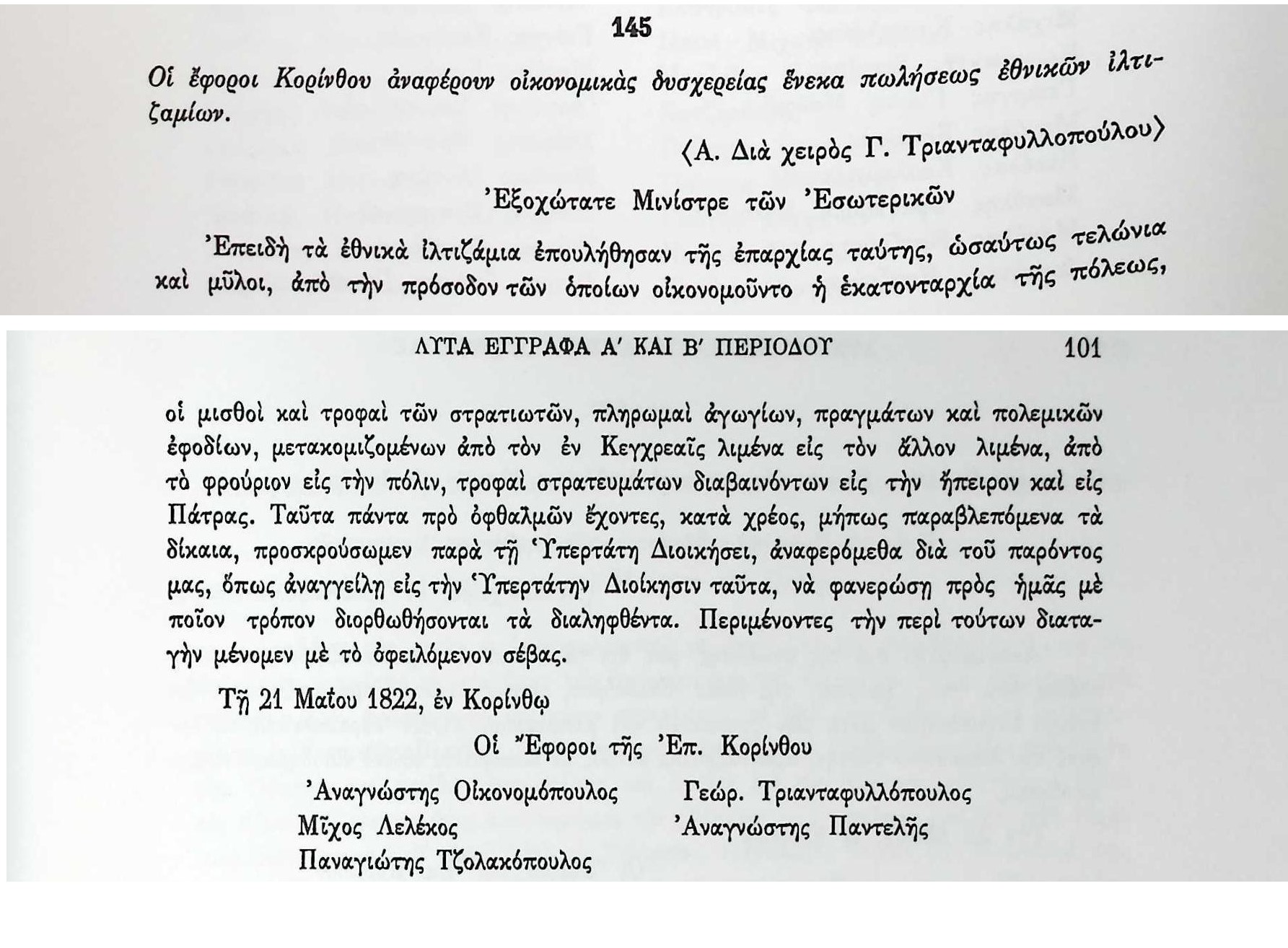 ΑΡΧΕΙΑ ΕΛΛΗΝΙΚΗΣ ΠΑΛΙΓΓΕΝΕΣΙΑΣ, τ.13, σελ.100,αρ.145 «Λυτά Έγγραφα» Α’ & Β’ Βουλευτικής Περιόδου-Έγγραφα Υπουργείου Εσωτερικών-Σχετικά με την πώληση εθνικών ιλτιζαμίων στην Κόρινθο. Αναγνώστης ΟικονομόπουλοςΑναγνώστης ΠαντελήςΓεωρ. ΤριανταφυλλόπουλοςΓεώργιος ΤριανταφυλλόπουλοςΕλλάδαΕπαρχίεςΈφοροιΙλτιζάμιΚεχριέςΚορινθίαΚόρινθοςΜισθοίΜίχος ΛελέκοςΠαναγιώτης ΤζολακόπουλοςΠάτραΠολεμοφόδιαΣτρατός-ΣτρατιώτεςΤελώνιαΥπέρτατη ΔιοίκησηΥπουργείο ΕσωτερικώνΦρούρια