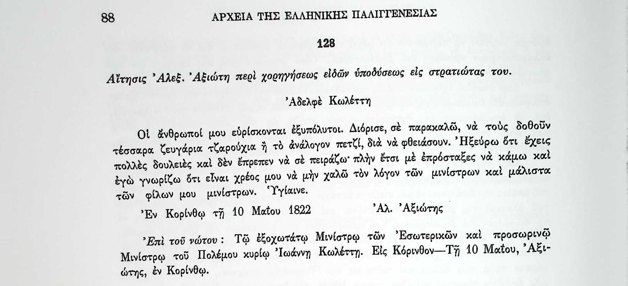ΑΡΧΕΙΑ ΕΛΛΗΝΙΚΗΣ ΠΑΛΙΓΓΕΝΕΣΙΑΣ, τ.13, σελ.88,αρ.128 «Λυτά Έγγραφα» Α’ & Β’ Βουλευτικής Περιόδου-Έγγραφα Υπουργείου Εσωτερικών-Αίτημα για υπόδηση στρατιωτών. Αλ. ΑξιώτηςΕλλάδαΙωάννης ΚωλέττηςΚορινθίαΚόρινθοςΣτρατός-ΣτρατιώτεςΥποδήματαΥπουργείο ΕσωτερικώνΥπουργείο Πολέμου