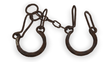 Το αντικείμενο που παρουσιάζεται είναι ένας σιδερένιος δεσμός αλόγου. Είναι ένα χειροποίητο προϊόν . Τα δεσμά χρησιμοποιούνταν για να ακινητοποιήσουν τα μπροστινά πόδια…
