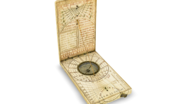 Το αντικείμενο που παρουσιάζεται είναι δίπτυχο ηλιακό ρολόι τύπου Νυρεμβέργης. Αποτελείται από δύο πλάκες από ελεφαντόδοντο που συνδέονται με ορειχάλκινους μεντεσέδες. Οι επιφάνειες…