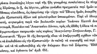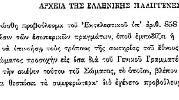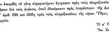 Οι δημογέροντες της Σαντορίνης αποστέλλουν επιστολή προς τον έπαρχο του νησιού κ. Δ. Δραγονάκο, τονίζοντας τη συμμετοχή της νήσου στην Επανάσταση. Παράλληλα εξαίρουν το ήθος, τα γενναία φρονήματα και τη φιλοπατρία κάποιων συμπολιτών τους οι οποίοι συκοφαντήθηκαν και μέσω παρούσας επιστολής αποβλέπουν στην αποκατάσταση της…