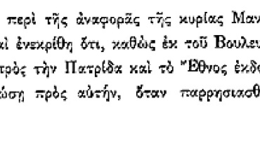 Στη συνέλευση της 12ης Ιουνίου 1823 συζητήθηκε η συνεισφορά της Μαντούς Μαυρογένους στον αγώνα υπέρ της Πατρίδος και του Έθνους .