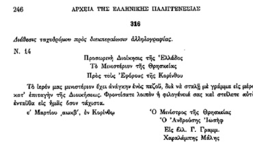 «Λυτά Έγγραφα» Α’ & Β’ Βουλευτικής Περιόδου-Έγγραφα Εκτελεστικού Σώματος-Αίτημα κατοίκων Κορινθίας για αντιστρατηγία της Επαρχίας Κορίνθου στον Ιωάννη Νοταρά.