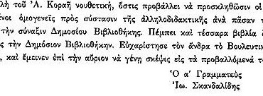 View ΑΡΧΕΙΑ ΕΛΛΗΝΙΚΗΣ ΠΑΛΙΓΓΕΝΕΣΙΑΣ-2-10 Ιανουαρίου 1824, παρ.8 Στη συνέλευση της 10ης Ιανουαρίου 1824 διαβάστηκε επιστολή του Αδαμάντιου Κοραή ο οποίος καλεί τους Έλληνες ομογενείς να συνεισφέρουν στη δημιουργία Δημόσιας Βιβλιοθήκης.