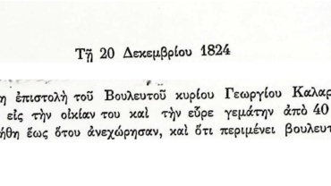Πρακτικά τακτικών συνεδριάσεων Βουλευτικού Σώματος Γ’Περιόδου-20 Δεκεμβρίου 1824-επιστολή Γ.Καλαρά.