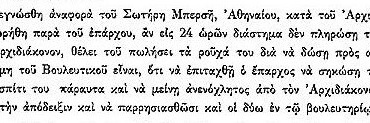 Στη συνέλευση της 12ης Σεπτεμβρίου 1823 διαβάστηκε αναφορά του Σωτηρίου Μπερσή, ο οποίος ενημερώθηκε από τον έπαρχο πως αν δεν πληρώσει τα γρόσια που χρωστάει στον Αρχιδιάκονο, θα του πουλήσει τα ρούχα για να ξεπληρώσει το χρέος.