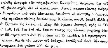 Στη συνέλευση της 1ης Ιουλίου 1823 οι πληρεξούσιοι της Καλαμάτας ενημερώνουν για την άσχημη συμπεριφορά που υπόκεινται από τους Μανιάτες και ζητούν την τοποθέτηση επάρχου. Το Βουλευτικό Σώμα αποφασίζει αναλόγως.