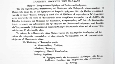 Στο Προβούλευμα του Εκτελεστικού της 20ης Ιανουαρίου 1822 ζητείται η έγκριση για κάλεσμα του Επιτρόπου των Πολεμικών στην Κόρινθο.