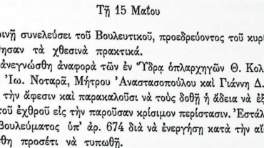 Πρακτικά τακτικών συνεδριάσεων Βουλευτικού Σώματος Γ’Περιόδου-15 Μαΐου 1825-Αίτημα οπλαρχηγών για αναχώρησή τους από την Ύδρα.