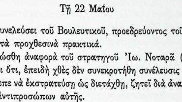 Πρακτικά τακτικών συνεδριάσεων Βουλευτικού Σώματος Γ’Περιόδου-22 Μαΐου 1825-Αναχώρηση Ιωάννη Νοταρά για εκστρατεία .