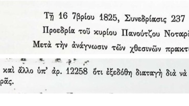 Πρακτικά τακτικών συνεδριάσεων Βουλευτικού Σώματος Γ’Περιόδου-16 Σεπτεμβρίου 1825-Συνεδρίαση 237-Σχετικά με τη μετάκληση του Ιωάννη Νοταρά.