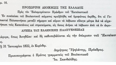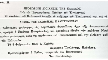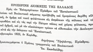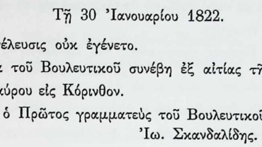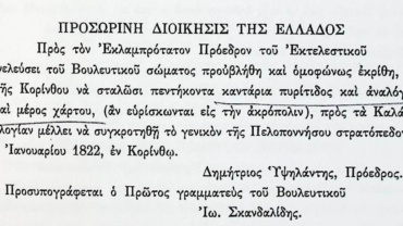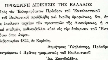 Στο πρ.21 της 7ης Φεβρουαρίου 1822 το Βουλευτικό Σώμα ανακάλεσε την προηγούμενη απόφασή του για αποστολή του Καπετάν Νικήτα στην Δυτική Ελλάδα και αποφάσισε την αποστολή του Δημητρίου Υψηλάντη και του Καπετάν Νικήτα στην Ανατολική Ελλάδα μαζί με στρατό από την Κόρινθο και τα…