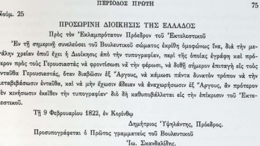 Στο πρ. 25 της 9ης Φεβρουαρίου 1822 του Βουλευτικού Σώματος αποφασίστηκε η οργάνωση τυπογραφείου στην Κόρινθο με την μεταφορά του από το Άργος.