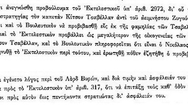 Συζήτηση περί συνοδείας για την ασφάλεια του Λόρδου Βύρωνα κατά την έλευσή του στην Ελλάδα.