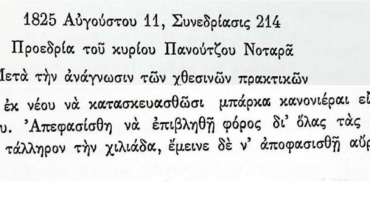 Πρακτικά τακτικών συνεδριάσεων Βουλευτικού Σώματος Γ’ Περιόδου- 11 Αυγούστου 1825-Συνεδρίαση 214-Επιβολή φόρου για την κατασκευή πυρπολητικών πλοίων για χρήση στον Κορινθιακό Κόλπο.