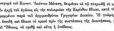 View ΑΡΧΕΙΑ ΕΛΛΗΝΙΚΗΣ ΠΑΛΙΓΓΕΝΕΣΙΑΣ-2-5η Σεπτεμβρίου 1823,παρ.4 Στη συνέλευση της 5ης Σεπτεμβρίου 1823 διαβάστηκε αναφορά του Κωνσταντίνου Μάνεση ο οποίος ζητά να πληρωθεί 1625 μπότσες κρασί που είχε δώσει την περίοδο της πολιορκίας του κάστρου της Κορίνθου.