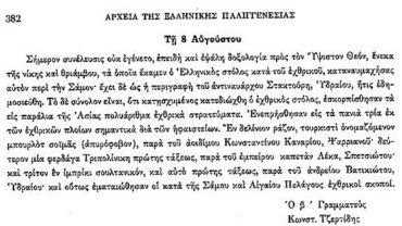View ΑΡΧΕΙΑ ΕΛΛΗΝΙΚΗΣ ΠΑΛΙΓΓΕΝΕΣΙΑΣ-2-8 Αυγούστου 1824 Την 8η Αυγούστου 1824 δεν έγινε συνέλευση αλλά εψάλη Δοξολογία για τη νίκη του εθνικού στόλου κατά του τουρκικού στη Σάμο.