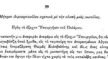 Ο Μήτρος Λυμπερόπουλος ενημερώνει το Υπουργείο Πολέμου για μια κλεμμένη πιστόλα για την οποία έχει ζητηθεί από τους κλέπτες ή να επιστραφεί ή να δώσουν χρήματα. Το Υπουργείο απαντά ή να επιστραφεί η πιστολά ή να πληρωθεί από τον αρχηγό τους.