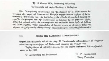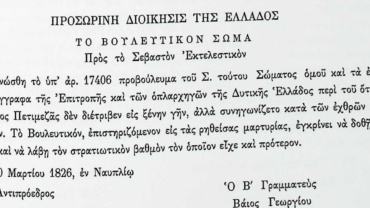 Μυστικές Συνεδριάσεις Βουλευτικού Σώματος Γ’ Περιόδου, 10 Μαρτίου 1826-Συνεδρίαση 346-σελ.521-Σχετικά με συμπεριφορά Κων. Πετμεζά .