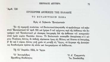 Β' Βουλευτική Περίοδος- Προβουλεύματα & Λοιπά Έγγραφα Βουλευτικού Σώματος , αρ.561, σελ.3- Μεταξύ άλλων και η τοποθέτηση του Νικόλαου Λόντου ως νέο μέλος του Εκτελεστικού Σώματος.