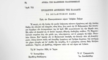 Η αναφορά της 30ης Απριλίου 1822 αφορά την επιστολή υποστήριξης στο πρόσωπο του Νικόλαου Λόντου ως προς την αδυναμία του να αναλάβει το Υπούργημα του Φροντιστού.