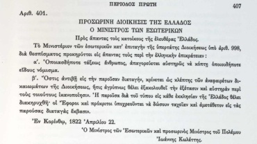 Η υπ'αρίθμ. 401 επιστολή του Υπ. Εσωτερικών αφοράτην απαγόρευση κοπής νομισμάτων από οποιοδήποτε κάτοικο.