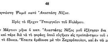 Ο Αναγνώστης Ψωμάς είχε δανείσει ένα γιαταγάνι στον Αναστάση Νέζο. Το γιαταγάνι λόγω διαφορών του Νέζου με τον Ζαχαρόπουλο κρατήθηκε από τον τελευταίο και με την παρούσα επιστολή ο Αναγνώστης Ψωμάς ζητά να ορίσει το Υπουργείο σε ποιόν ανήκει το γιαταγάνι.
