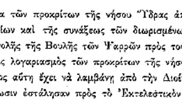 Στη συνέλευση της 22ας Μαΐου 1823, διαβάστηκε γράμμα των προκρίτων της Ύδρας σχετικά με τον απόπλου των πλοίων και τη συγκέντρωση των γροσίων. Επίσης παρουσιάστηκε αντίγραφο του λογαριασμού που έχει να λάβει η Ύδρα .