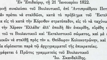 Στη συνέλευση της 21ης Ιανουαρίου 1822 έγινε συζήτηση σχετικά με το στρατόπεδο της Κορίνθου.