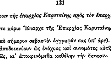 Οι υπογράφοντες κάτοικοι της επαρχίας της Καρύταινας, αποστέλλουν αναφορά στον τοπικό έπαρχο σε απάντηση δικού του εγγράφου. Στο έγγραφο του επάρχου περιλαμβάνονται ως ένοχοι και συνωμότες και οι υπογράφοντες και δια της παρούσης αναφοράς θέλουν να αποκαταστήσουν την αλήθεια. Γι'αυτό κατονομάζουν τους πραγματικούς …